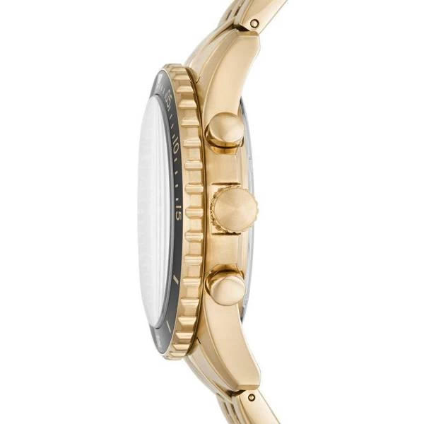 A watch for men from Fossil which runs on batteries. Just swap them out if the watch stops. The watch face, hands and case make for a great design. The gold strap is made from stainless steel. This watch should survive getting wet, since it is water protected up to 10 atm (100m).
